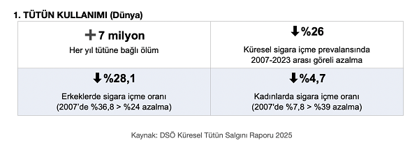 Güçlü uygulama ve denetimin, tütün kontrolü yasalarına uyumun sağlanmasında kritik rol oynadığı vurgulanıyor. Kapsamlı dumansız alan yasası uygulayan ülke sayısı 2007’de 10 iken bugün 79’a ulaşmış durumda. Bu ülkelerde en iyi uygulama düzeyindeki yasalarla korunan insan sayısı ise 2,6 milyara ulaşıyor.